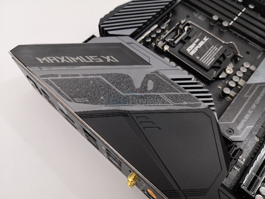 Motherboard ini hadir dengan sebuah I/O shroud yang menurut kami sudah menjadi sebuah tren saat ini. I/O shroud di Maximus XI Hero Wi-Fi ini terlihat sangat sederhana dan menarik, serta terlihat berukuran cukup besar. Hanya terdapat tulisan “Maximus XI” di shroud ini, serta alur diffuser yang bertujuan untuk membuat cahaya RGB dari LED yang ada di balik shroud terlihat seperti PCB traces.