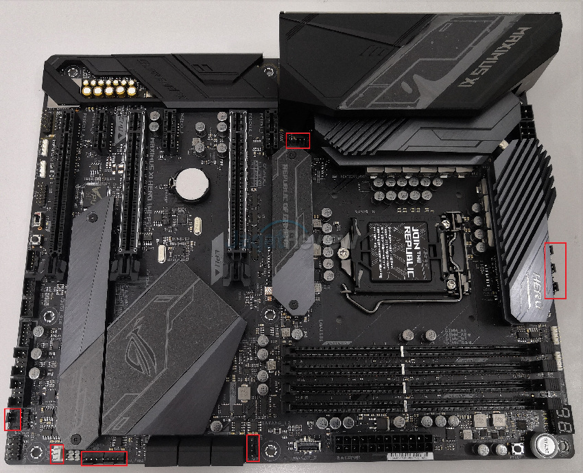 Jumlah fan header yang dapat kita temukan pada motherboard ini adalah 9 buah. Sebanyak 8 buah fan header yang tersedia berupa 4-pin fan header yang siap berjalan dengan mode PWM atau DC Regulated. Sedangkan header 1 lainnya adalah sebuah 3-pin fan header yang berfungsi sebagai waterflow sensor. Jumlah yang menurut kami sangat berlimpah!
