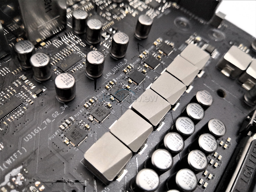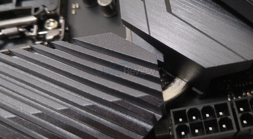 Untuk VRM CPU, motherboard ini menggunakan konfigurasi 10 phase (8+2). VRM heatsink yang digunakan pada motherboard ini sangat besar dan memiliki surface area yang sangat luas. VRM Heatsink ini juga terlihat membantu mendinginkan komponen inductor. Terlihat, terdapat thermal pad yang langsung bersentuhan dengan VRM heatsink.
