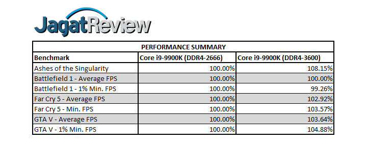 Melihat peningkatan sekitar 2% ~ 5% tersebut, dibandingkan dengan harga RAM DDR4-2666 dan DDR4-3600, memang peningkatan ini akan dirasa tidak begitu menarik. Selisih harga antara DDR4-2666 dengan DDR4 dengan kecepatan di atas 3000 MHz memang bisa dikatakan cukup jauh untuk saat ini. Walaupun begitu, untuk yang memang benar-benar ingin mendapatkan performa yang lebih baik dari sekadar hanya menggunakan DDR4 sesuai yang “resmi” didukung oleh Intel, opsi penggunaan RAM DDR4 kecepatan tinggi memang bisa dilakukan.