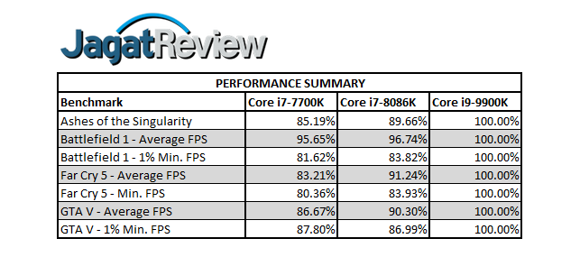 Bila dibandingkan dengan Core i7-8086K pun, keunggulan dua core dari prosesor ini berhasil membuatnya memiliki menawarkan kelebihan tersendiri. Perbedaan performa hingga hampir 30% pun masih mungkin dirasakan, di skenario multi-threading. Tidak bisa dipungkiri, untuk desktop kelas mainstream, Core i9-9900K ini merupakan prosesor terkencang yang ditawarkan oleh Intel, yang bahkan langsung meninggalkan pendahulunya dengan jarak yang cukup jauh.
