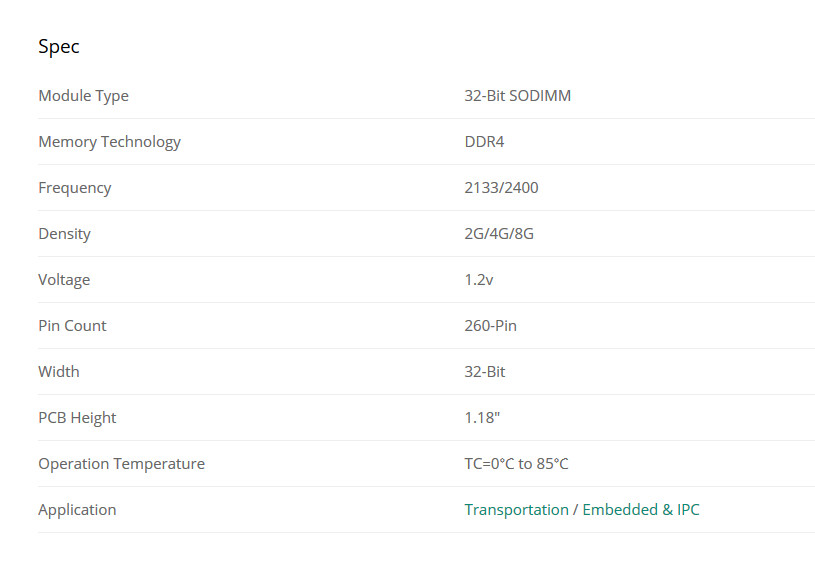 Spesifikasi memori SO-DIMM DDR4 32-bit yang disediakan oleh Apacer adalah DDR4-2133, DDR4-2400, dan DDR4-2666. Dengan opsi kapasitas 2GB, 4GB, dan 8GB. Secara khusus bahwa memori 32-bit DDR4 SO-DIMM ini didesain untuk mendukung penuh prosesor yang dibuat oleh perusahaan seperti NXP, Freescale, Marvell, Cavium, dan Texas Instrument. Memori 32-bit ini sendiri tidak akan dapat digunakan pada prosesor x86 dikarenakan adanya perbedaan arsitektur memory controller.