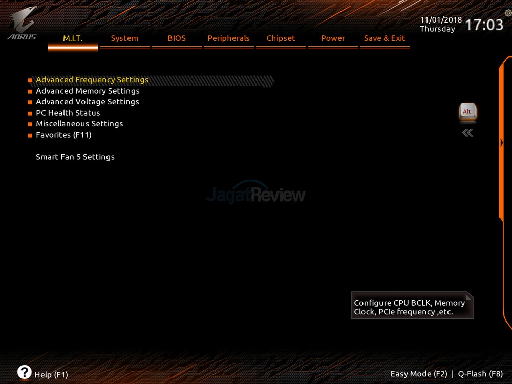 Tab ini adalah tab yang berisi opsi-opsi konfigurasi utama yang bersangkutan dengan kinerja CPU, Memory, dan Voltage rail. Pada bagian BIOS ini akan diakses oleh orang yang ingin melakukan tuning terhadap performa sistem. Karena seluruh setting yang yang besangkutan dengan multiplier CPU dan Memory akan di jumpai disini, termasuk dengan setting timing memori, Dan biasanya Opsi M.I.T ini sendiri memang lebih identik dengan overclocking terutama pada motherboard seri Z Intel dan X AMD. Dan jelas tujuan M.I.T tab ini membuka kapabilitas fine tuning performa sistem bagi yang ingin mencoba mencari sedikit performa lebih.