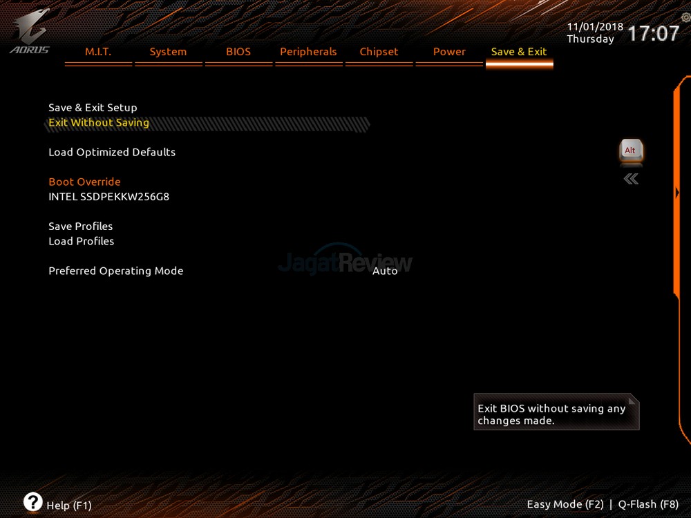 BIOS yang digunakan untuk Gigabyte Aorus Z390 akhirnya menggunakan desain/skin BIOS yang baru. Menurut kami BIOS milik Gigabyte Aorus pada Z390 ini jauh lebih baik, lebih intuitif dari desain BIOS sebelum ini. BIOS yang digunakan kali ini memiliki tema hitam orange. Di setiap BIOS motherboard Gigabyte terdapat dua mode, yaitu Easy Mode dan Advanced Mode. Secara tampilan, BIOS ini bisa dikatakan sangat sederhana dan opsi-opsi yang terkait dengan satu fungsi dikelompokkan sehingga pengguna dapat dengan mudah mencari opsi yang mereka butuhkan.