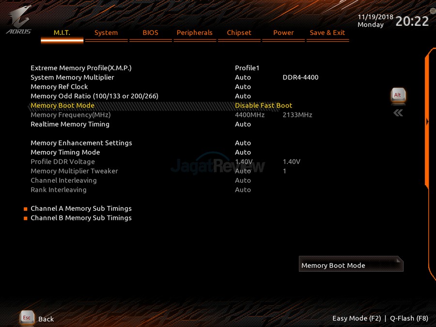 Kami pun tidak segan untuk menantang motherboard ini untuk menjalankan memori kami yang memiliki XMP DDR4-4400! Kami menggunakan memori Galax HOF Extreme DDR4-4400 dengan tipe PCB A0.