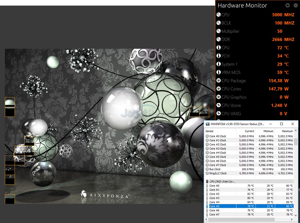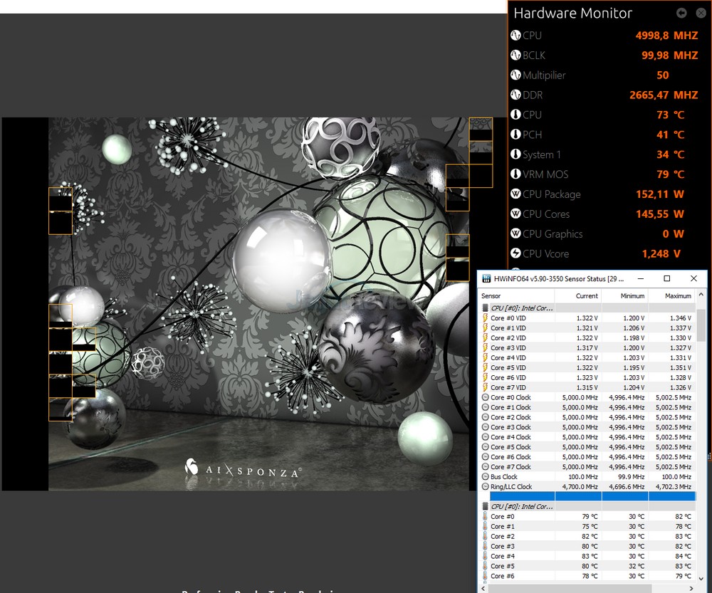 Hasil di atas ini mennunjukan bahwa sensor VRM MOS pada Easy Tune Hardware Monitor sudah menunjukan suhu 79°C suhu ini sudah mencapai batas tidak aman untuk kesehatan VRM motherboard yang kami gunakan. Di titik ini kami sudah merasa bahwa cooling yang digunakan untuk VRM motherboard ini tidak dapat menahan dan menanggulangi panas yang dihasilkan dari switching loss VRM. Terliaht bahwa pada motherboard ini CPU Package sudah mencapai 150W yang berarti VRM ini memberikan suplai ~120A kepada Intel Core i9-9900K, yang berarti bahwa ini baru 1/2 dari kemampuan maksimal VRM yang dimiliki motherboard ini.