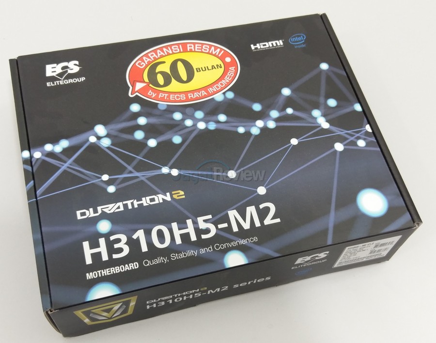 Box yang ditawarkan ECS untuk H310H5-M2 terlihat sangat sederhana. Tampilan luar box ini hanya menunjukkan warna dasar biru tua doff dengan beberapa titik-titik putih seperti lampu. Tidak ada yang spesial dari box ini.