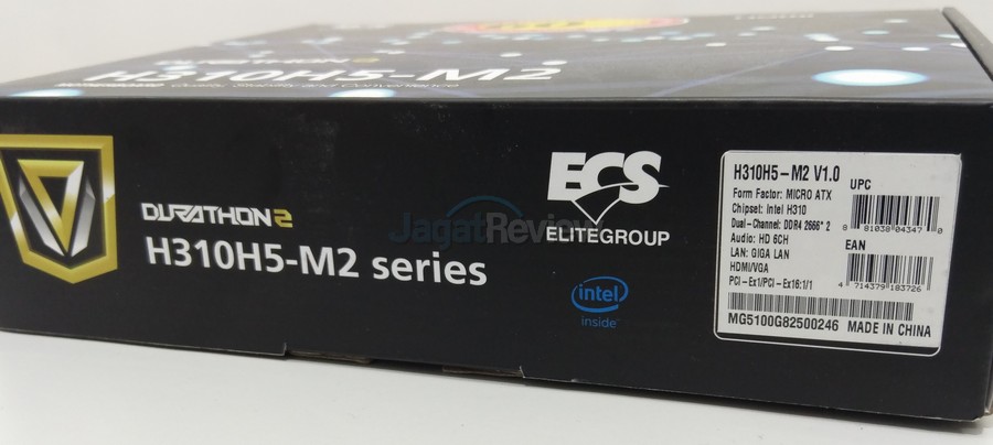 Di bagian belakang box, terdapat informasi fitur utama yang ditawarkan motherboard ini. Hal ini sama seperti motherboard lain pada umumnya. Selain itu, ada juga logo Durathon 2, yang merupakan set komponen dan fitur yang menjadi inti dari motherboard ECS H310H5-M2 ini.