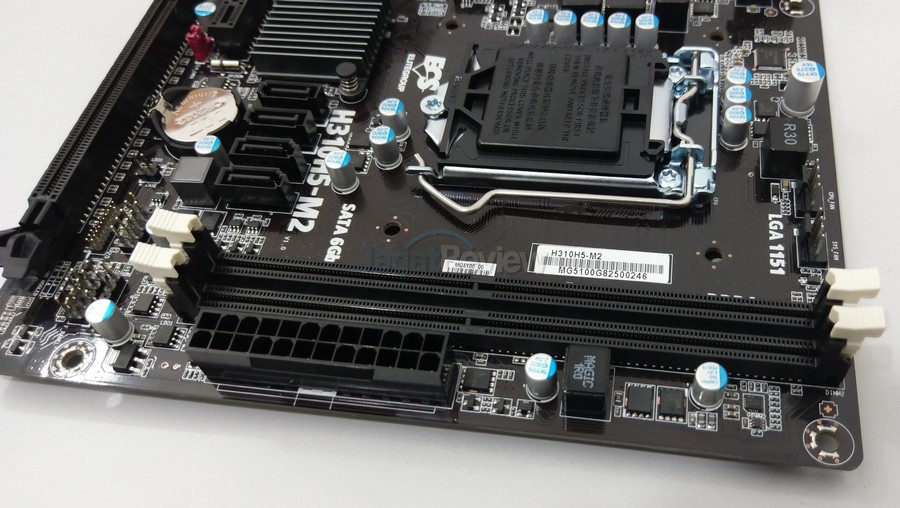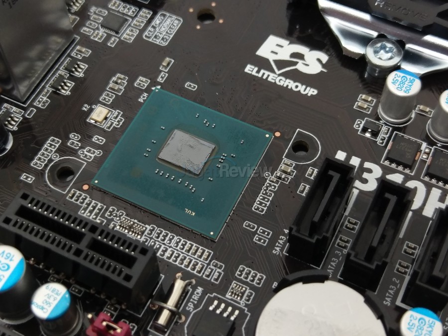 Di balik heatsink PCH, digunakan thermal pad untuk menghantarkan panas dari chipset H310 ke heatsink. Seperti yang sudah disebutkan di atas, terdapat chipset Intel H310 di balik heatsink itu. Kami merasa bahwa chipset yang digunakan pada motherboard ini menggunakan fabrikasi 14nm, dengan melihat dari ukuranya.