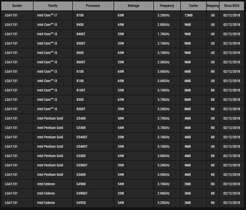 Melihat VRM yang digunakan untuk motherboard ini, dapat dikatakan cukup untuk bisa menjalankan setidaknya sampai dengan Intel Core i7-8700 (6 core/12 thread) yang memiliki TDP 65 Watt. Sesuai dengan support resmi yang dimiliki motherboard ini pada web ini: CPU Support List