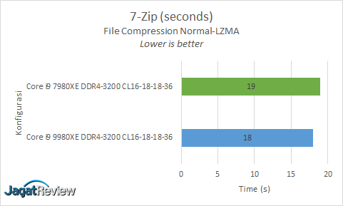 7-Zip merupakan aplikasi freeware popular yang digunakan untuk melakukan kompresi kepada file yang diinginkan untuk memperoleh ukuran file yang lebih kecil. Tool kompresi file yang satu ini memiliki kemampuan scaling multicore. Di aplikasi ini Anda dapat memilih konfigurasi kompresi seperti apa yang Anda inginkan, dan juga Anda dapat memilih berapa thread dari prosesor Anda yang akan digunakan untuk melakukan kompresi. Skenario test kami adalah melakukan compression adalah LZMA, Normal Compression. Indikasi performa yang digunakan adalah seberapa cepat prosesor yang digunakan menyelesaikan kompresi.