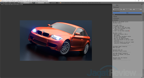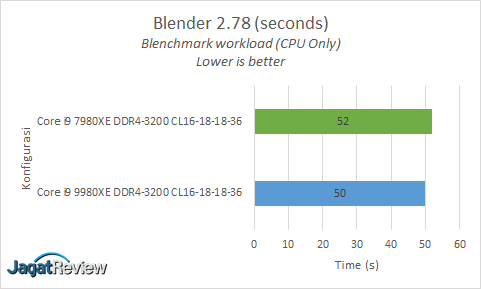 Blender dikenal sebagai aplikasi 3D modeling yang gratis dan juga open source. Kami menggunakan aplikasi ini untuk menguji performa prosesor dalam melakukan render pada objek 3D. Hasil pengujian disajikan dalam satuan waktu yaitu detik. Semakin sedikit waktu yang dibutuhkan, semakin baik. Untuk workload-nya sendiri, kami menggunakan Blenchmark 1.0.6 (Blenchmark.com)