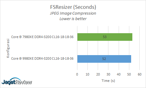 FSResizer merupakan aplikasi freeware yang umum untuk digunakan melakukan batch image conversion/rename/resize yang mendukung berbagai format. Aplikasi ini juga bisa digunakan untuk memberi watermark di suatu gambar. Aplikasi ini sendiri bekerja dengan menuntut kemampuan single-threaded dari suatu prosesor. Di pengujian ini kami akan mengubah 100 file JPEG dengan ukuran 3 MB ~ 6 MB menjadi file JPG kecil dengan standar ukuran 500 pixel. Indikasi performa yang digunakan adalah waktu yang dibutuhkan untuk menyelesaikan konversi JPEG tersebut, semakin cepat maka semakin baik.