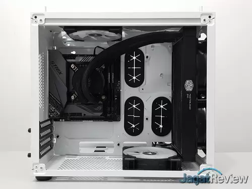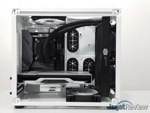 Sebagai alternatif, kita bisa memasang radiator watercooling di sisi atas casing bila ingin menggunakan graphics card hingga panjang 300 mm. Ruang yang tersedia di sisi atas terbilang cukup memadai untuk sebuah radiator 240 mm dan kipasnya, tidak menutup akses ke motherboard. Bahkan, bila pengguna tidak terlalu masalah dengan ruang yang mungkin agak sedikit sempit, radiator 280 mm pun masih memungkinkan untuk digunakan di sisi atas.