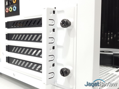 Terkait pemasangan graphics card, casing ini menawarkan mekanisme pengunci khusus untuk slot ekspansi. Pengunci tersebut bisa dibuka dengan membuka dua baut yang ada. Kami melihat, di bagian rangka casing di area pemasangan expansion card sebenarnya tersedia lubang untuk memasang baut, untuk mengencangkan card. Namun, dari semua baut yang ada di paket perlengkapan, tidak ada yang cocok bila digunakan di lubang tersebut. Sehingga, akhirnya, kami hanya menggunakan mekanisme pengunci tersebut untuk mengunci graphics card.