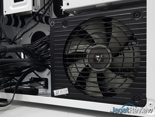 Komponen terakhir yang kami pasang adalah PSU. Pemasangan PSU ke posisinya di casing ini bisa dikatakan mudah, dan dapat dilakukan dengan cepat. Kita hanya perlu menempatkan PSU di posisinya, kemudian menguncinya ke casing dengan empat buah baut. Satu hal yang perlu diperhatikan dari pemasangan PSU adalah arah kipas dari PSU. Hadapkan kipas PSU, atau setidaknya lubang kipas di PSU, ke arah luar, bukan ke arah tray motherboard.