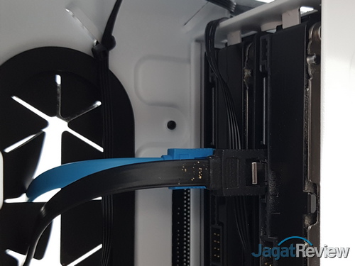 Sementara untuk storage 2.5″, karena posisi konektor menghadap ke bawah, kami sedikit mengalami kesulitan, di mana desain konektor di kabel SATA yang kami gunakan, tanpa klip, membuat konektor beberapa kali lepas dari posisinya. Hal tersebut bisa diatasi dengan menggunakan kabel SATA lain yang menggunakan klip, sehingga konektor tidak mudah lepas dari tempat pemasangannya. Sementara untuk power SATA, posisi dari kedua storage 2.5″ yang digunakan juga tidak menyulitkan pemasangan konektor power SATA, dan kembali, satu konektor yang tersisa di kabel kami gunakan untuk memasok daya ke kontroler RGB di casing ini.