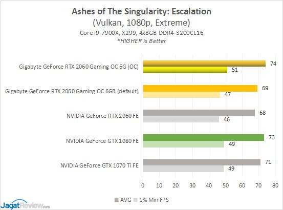 Cukup sesuai dengan hasil di benchmark sintetis, walau GeForce GTX 1080 sedikit lebih unggul dari RTX 2060 Founders Edition, GeForce RTX 2060 dari Gigabyte yang datang pre-overclocked memiliki performa sekelas GeForce GTX 1080. Tentu, keunggulan ini lebih terlihat lagi pada saat Gigabyte RTX 2060-nya di-overclock, dan mengalahkan GTX 1080 FE secara konstan,