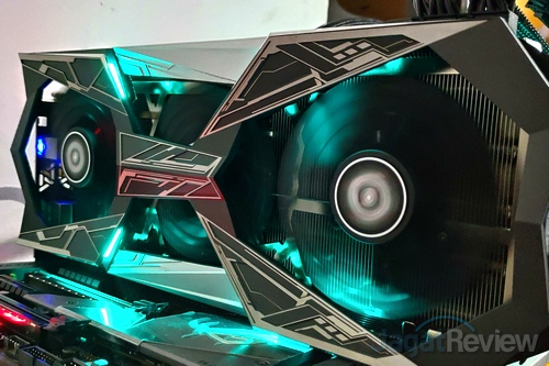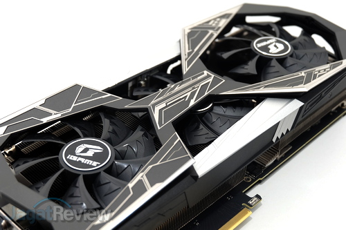 Sistem pendingin itu ditutup oleh shroud, atau yang disebut Colorful sebagai “armor” dengan corak “Outer Space Texture”. Fungsi utama dari shroud ini tentu saja adalah untuk meningkatkan aspek tampilan dari graphics card ini. Untuk itu, Colorful memasang RGB LED di bagian tengah shroud tersebut, mengarah ke kipas yang terletak di tengah.