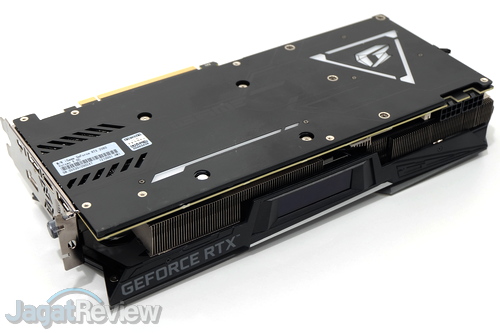 Sementara di sisi belakang graphics card ini, Colorful menempatkan backplate, yang tentu saja membantu meningkatkan lagi aspek tampilan, serta menjaga agar graphics card tidak bengkok karena bobotnya sendiri. Backplate ini dihias oleh logo iGame dan juga area dengan RGB LED. Warna dari RGB LED ini sengaja diatur agar sama dengan di bagian depan. Pengaturan RGB LED itu bisa dilakukan melalui aplikasi.