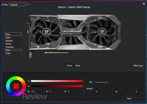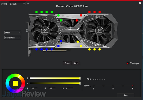 Untuk jumlah efek, tidak banyak preset efek yang disediakan oleh Colorful. Namun, menurut kami, preset efek yang tersedia sudah cukup untuk mendukung kustomisasi tampilan graphics card ini. Colorful juga masih menyediakan opsi untuk tuning masing-masing efek, berupa kecepatan efek serta arah gerak efek, bila memang ada efek gerakan ke efek tersebut.