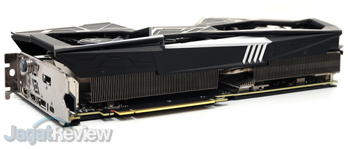 Di ujung belakang graphics card, terlihat terdapat beberapa konektor khusus yang ditempatkan Colorful. Tidak ada penjelasan detail mengenai fungsi konektor-konektor tersebut. Namun, melihat kabel-kabel yang terpasang ke konektor tersebut mengarah ke “armor” dari graphics card ini, bisa disimpulkan bahwa konektor-konektor tersebut terkait dengan fungsi kontrol RGB, sensor suhu operasi, serta panel iGame Status Monitor.
