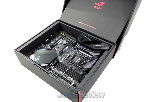 Ketika kemasan dibuka, terlihat logo ASUS ROG dan tulisan “Welcome to The Republic” menyambut pengguna. Desain ini pun sudah digunakan ASUS di lini ROG Maximus dari generasi sebelumnya. Walaupun ini terbilang sederhana, bagi pengguna motherboard ROG Maximus Series, hal ini tentu saja akan menjadi semacam sambutan “eksklusif” tersendiri.