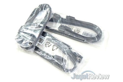 Unit motherboard ditempatkan di balik penutup dari plastik transparan. Wadah motherboard di kemasan paket penjualan bisa diangkat untuk mengakses kompartemen di bawahnya. Kompartemen tersebut berisi berbagai perlengkapan pendukung motherboard ini, yang dibagi ke empat ruang terpisah. Berikut ini adalah deretan perlengkapan untuk motherboard ini: