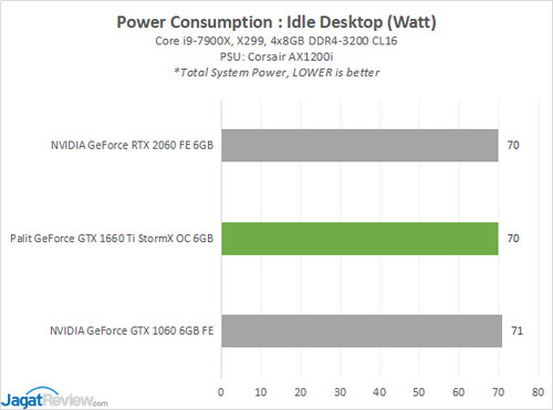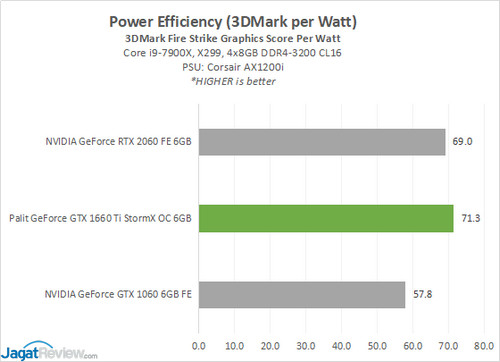 Konsumsi daya Palit GTX 1660 Ti StormX OC termasuk masuk akal, dan efisiensi daya (Performance per watt) dari VGA tersebut sedikit lebih baik dari RTX 2060 yang kami uji.