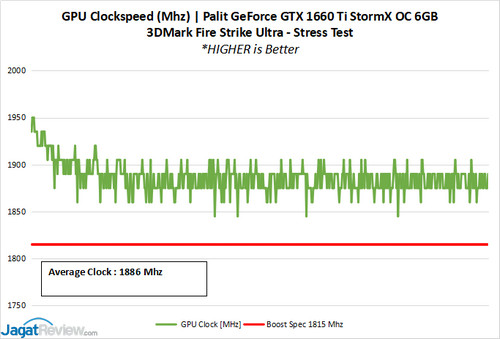 Meski memiliki spesifikasi Boost pada 1815Mhz, Palit GTX 1660 Ti StormX terlihat masih beroperasi di atas nya, yakni rata-rata 1886Mhz.