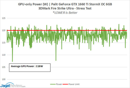 Mengingat graphics card ini sudah mengalami factory OC, nampak cukup wajar melihat bahwa GPU ini sering sekali ‘menyentuh’ batas 120W yang diterapkan.