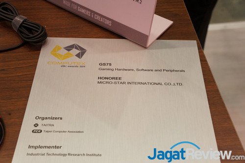 MSI GS75 mendapatkan Computex d&i Awards Honoree, dan juga penghargaan dari European Hardware Awards 2019 sebagai Best Gaming Notebook.
