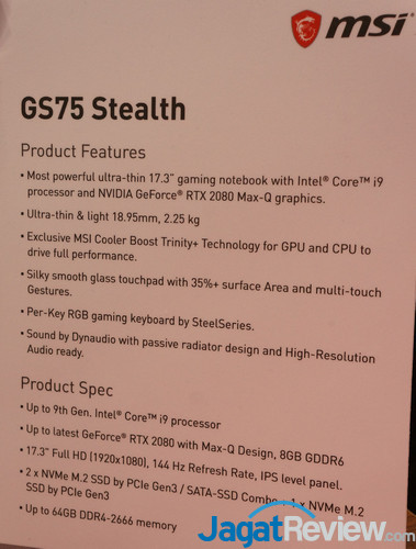 MSI GS-series, GS65 Stealth dan GS75 Stealth dikenal sebagai solusi notebook tipis dari MSI, namun masih menyediakan processing power yang melimpah. Semua ini dicapai berkat penggunaan GPU NVIDIA GeForce 2080 Max-Q. Sebagai pendingin, kedua notebook ini dilengkapi Cooler Boost Trinity, yang sanggup mendinginkan laptop berprosesor Intel Core i9 tersebut.\