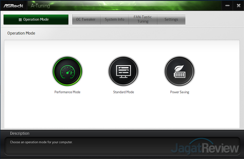 Terakhir, ada fitur untuk mengubah Operation Mode dari sistem secara mudah. ASRock menyediakan tiga buah preset, yaitu Performance Mode, Standard Mode, serta Power Saving. Pengguna bisa memilih salah satu profil sesuai dengan kebutuhan aktivitas yang tengah mereka lakukan.