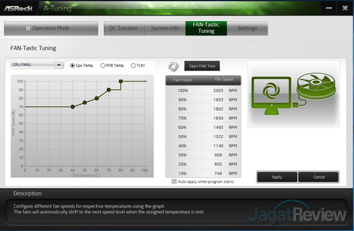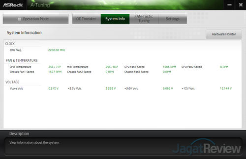 Aplikasi ini juga mengusung fitur pemantauan kondisi PC, di bagian System Info. Kita bisa melihat informasi voltase, kecepatan fan, serta suhu beberapa komponen. Ada juga FAN-Tastic Tuning, yang berfungsi untuk pengaturan otomatis kipas yang ada di sistem. Pengaturan manual juga bisa dilakukan untuk kipas-kipas itu.