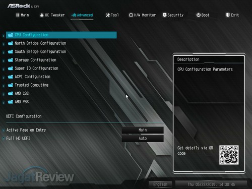 ASRock tidak menyertakan “Easy Mode” di motherboard ini, jadi satu-satunya opsi yang tersedia adalah pengguna harus berhadapan dengan mode “Advanced” di BIOS. Hal ini memang umum dijumpai di produk ASRock untuk AMD. Saat pertama dibuka, tab yang tampil adalah “Main”, yang berisi beberapa informasi terkait motherboard, prosesor yang digunakan, serta konfigurasi RAM.