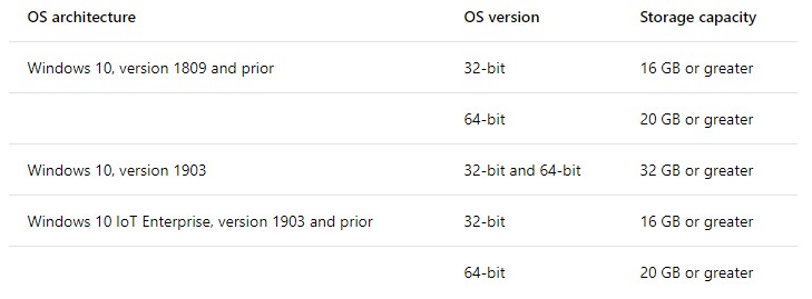 Untuk versi 1809, versi Windows 10 aktual saat ini, sistem operasi itu membutuhkan kapasitas penyimpanan minimal 16 GB untuk OS versi 32-bit atau 20 GB untuk 64-bit. Mulai versi 1903, Windows 10 untuk versi 32-bit dan 64-bit membutuhkan storage minimal sebesar 32GB. Hal ini berlaku untuk instalasi baru maupun instalasi melalui Windows Update.