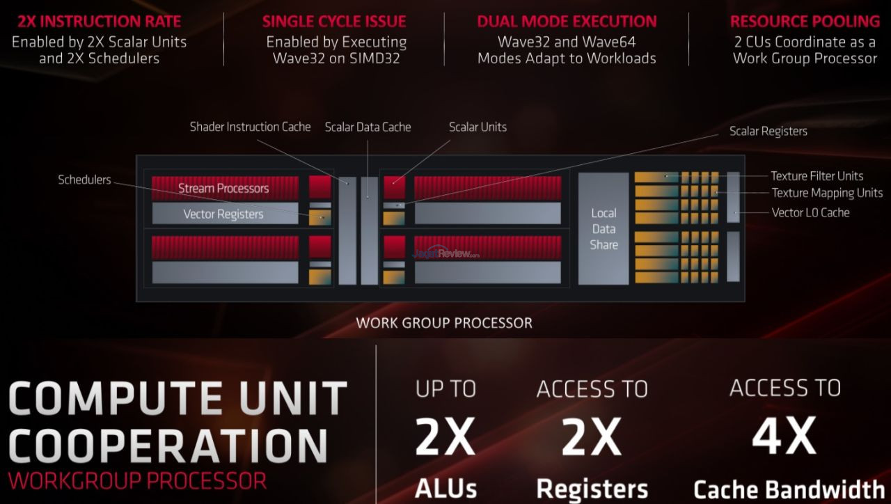 Seperti yang bisa dilihat dari overview chip Navi, 2(Dua) Compute Unit dari Navi bisa dikonfigurasikan menjadi ‘Dual Compute Unit‘ atau ‘Workgroup Processor‘ seperti ini: