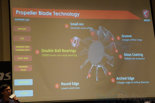 Mengingat suhu chipset X570 agak tinggi karena rating TDP-nya besar (11-15W untuk X570 dibanding X470 yang <5W), chipset fan menjadi kewajiban. Untuk mengurangi kebisingan sekaligus menambah umur pakai, MSI hanya menyalakan fan tersebut pada suhu tertentu (sekitar 60C, ini bisa diatur). Banyak pula teknologi dari fan tersebut yang datang dari teknologi VGA mereka.