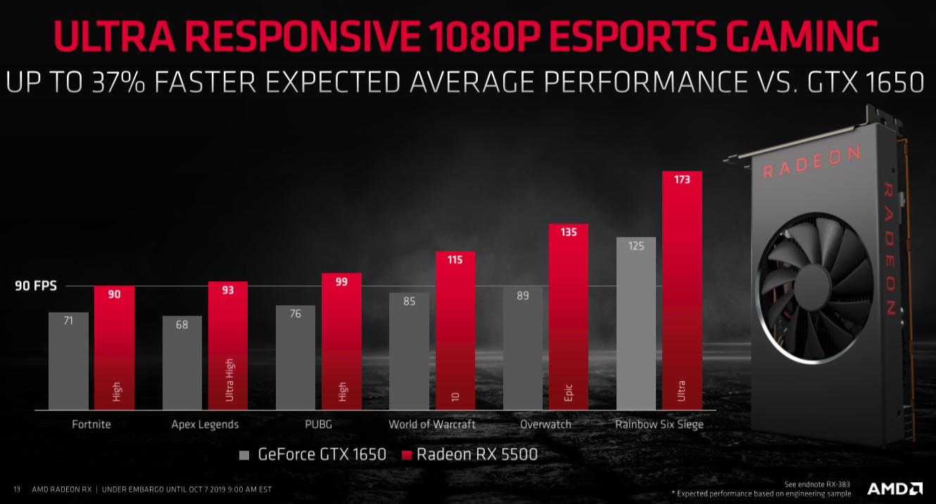 - RX 5500 memiliki performance sekitar 12% lebih tinggi dari RX 480, dengan menggunakan daya 30% lebih rendah (total 1.6x performance-per-watt)