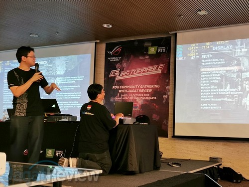 Mengawali acara, tim Jagat Review yang diwakili Alva Jonathan, Gatot Tri Yuwono, dan Rifqi Sulthan menampilkan demo DirectX Ray-Tracing (DXR) dengan menggunakan GeForce RTX yang ada di gaming laptop ROG Strix Scar III. Laptop tersebut dibekali dengan prosesor Core i9-9880H dan GPU GeForce RTX 2070, sehingga menawarkan performa gaming yang sangat tinggi. Dua game dengan DXR dijalankan di laptop itu, yaitu Shadow of the Tomb Raider dan Control.
