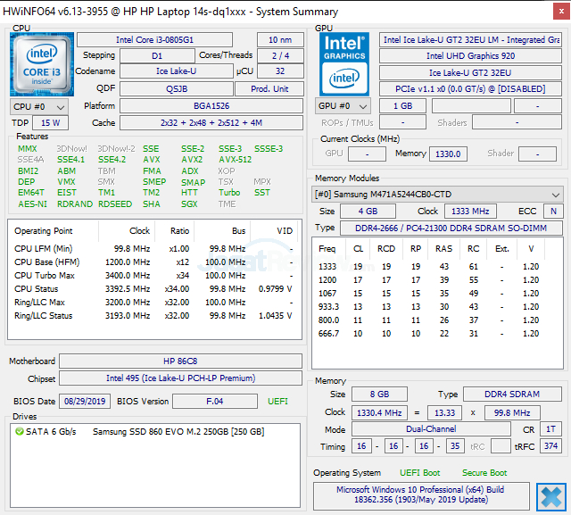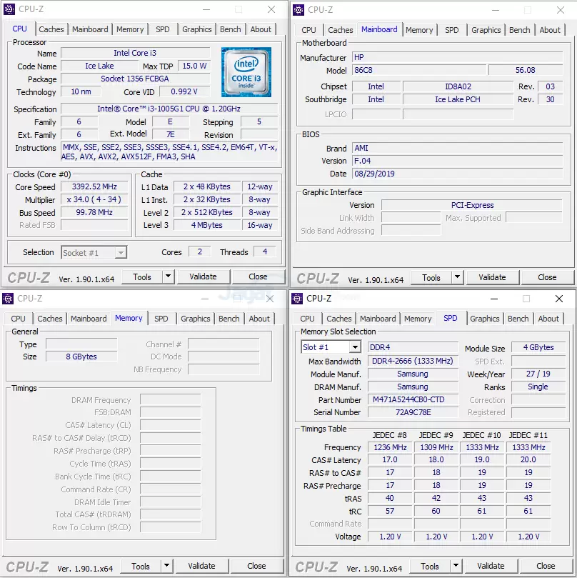 Berikut ini spesifikasi CPU Core i3-1005G1, berdasarkan hasil deteksi CPUZ dan HWiNFO