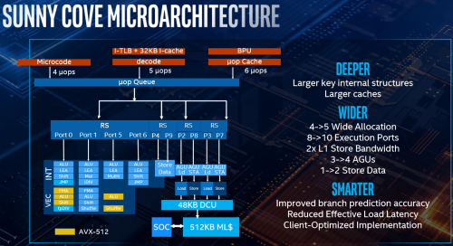 - Sunny Cove core memiliki beberapa perubahan pada konfigurasi CPU Cache. CPU Core ‘Sunny cove’ memiliki L1 Data cache 48 KB per core, dan L2 cache 512 kB per core (di Skylake – L1 Data Cache : 32 kB per core / L2 : 256 kB per core)