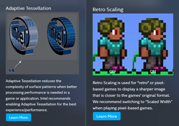 Pada Gen11 Graphics ini juga mulai ada beberapa menu pengaturan baru, seperti pengaturan untuk penggunaan Adaptive Tesselation, dan juga Retro Scaling. Kedua fitur ini belum kami uji, dan mungkin akan jadi bahan pembahasan di masa mendatang.