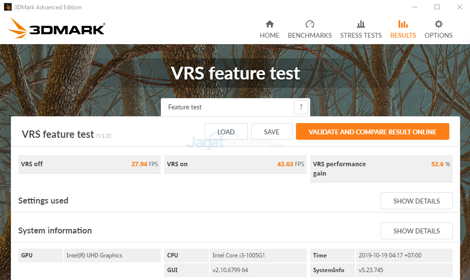 Salah satu fitur yang membuat kami yakin bahwa IGP Intel UHD Graphics yang ada di i3-1005G1 benar merupakan Gen11 dan bukan Gen9 yang di-refresh adalah kemampuan untuk menjalankan 3DMark Variable Rate Shading(VRS) feature test, karena pada saat pengujian fitur ini hanya bisa dijalankan beberapa GPU modern (Gen11 Graphics Ice Lake adalah salah satunya).