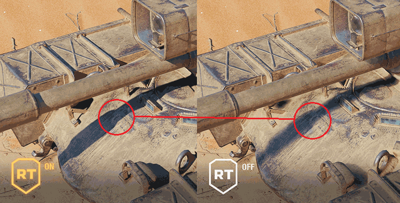 Berikut ini WoT menunjukkan bagaimana ray traced shadow dapat menghasilkan kualitas bayangan yang superior, mereka secara spesifik menerapkan ray tracing pada area di sekitar tank yang mendapat pencahayaan langsung dari Matahari :