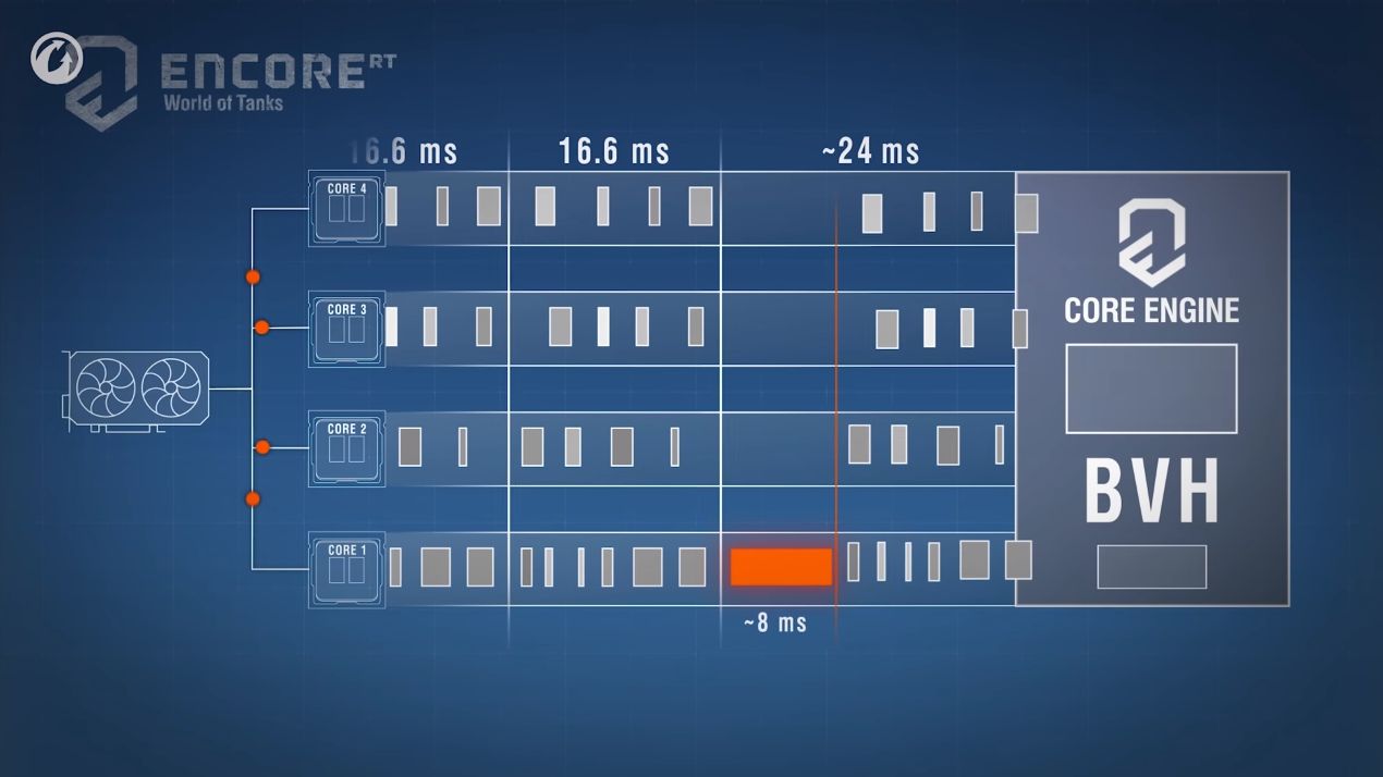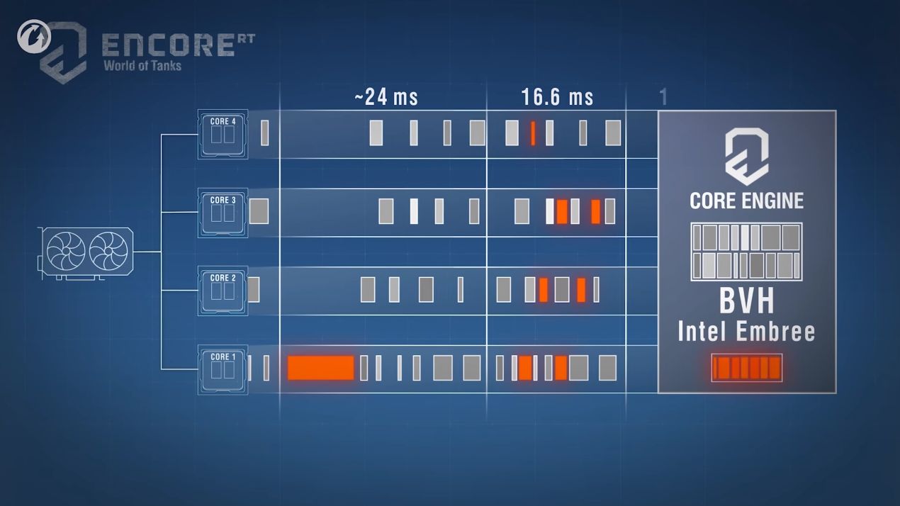 Pada awalnya perhitungan BVH ini masih membutuhkan 8 ms per frame, membuat game yang tadinya berjalan 60 FPS / 16.6 ms mendapat penurunan frame signifikan ke sekitar 40-an FPS (24ms frametime). Ini jelas tidak ideal karena perhitungan BVH masih memakan terlalu banyak waktu. Untungnya, berkat kolaborasi antara developer WoT dengan Intel Advanced Rendering engineer dan Intel Embree technology(Embree.org), proses BVH ini bisa dilakukan secara lebih efisien ketika dibagi ke berbagai core CPU.