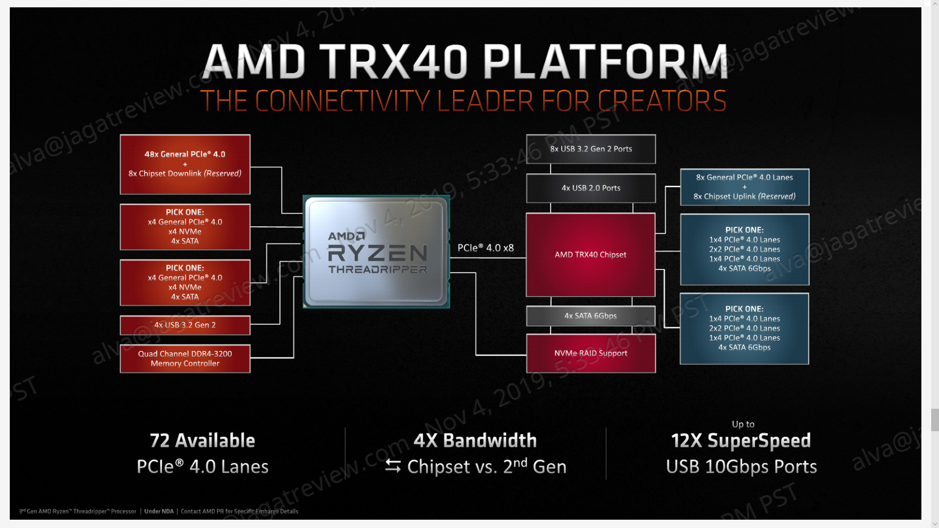 Threadripper ini juga akan ditawarkan pada socket baru sTRX4 pada platform TRX40 yang mendukung Quad-channel DDR4-3200 dan 88-lane PCIe 4.0. Sayang sekali, sTRX4 tidak akan kompatibel dengan socket TR4 generasi sebelumnya.