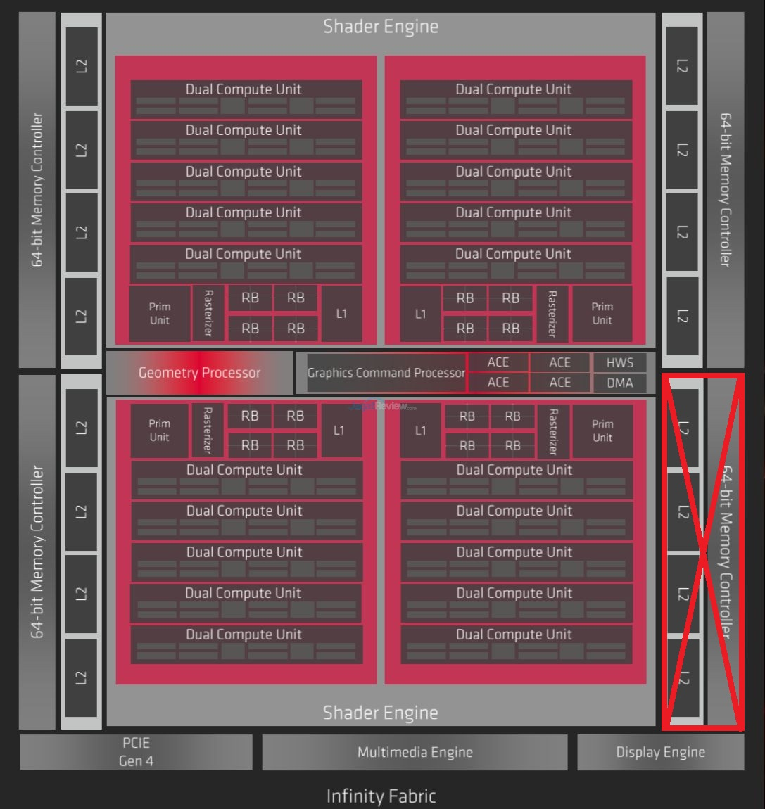 Nampak di atas RX 5600XT nampak menjadi sebuah versi cut-down dari RX 5700, dengan pengurangan satu bagian memory controller. Sayangnya, pemotongan bagian ini juga akan mengurangi jumlah L2 Cache pada RX 5600XT menjadi 3MB (di RX 5700 series ada full 4MB).