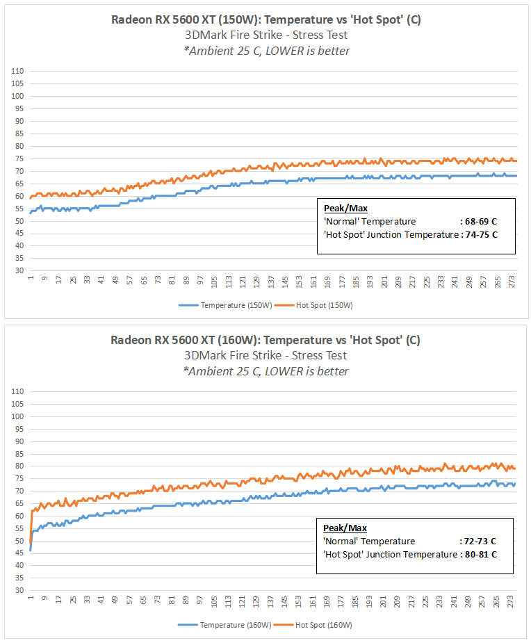 Suhu ‘hot spot’ dari RX 5600 XT nampak masih terjaga wajar dalam keadaan BIOS pre-overclocked 160W sekalipun. Perbedaan suhu ‘normal’ dan ‘hot spot’ yang tidak terlalu jauh juga mengindikasikan bahwa power density dari RX 5600 XT masih masuk akal, karena chip GPU-nya diset pada kisaran Voltage/Frequency yang rendah.